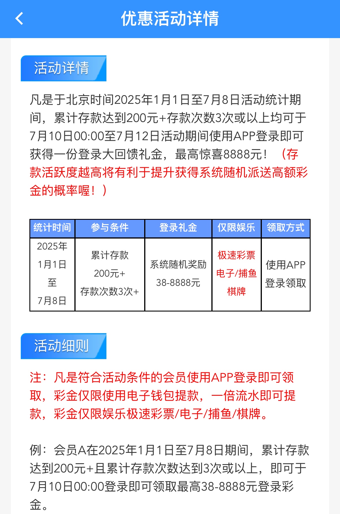 2025年1月1日至7月8日活动统计期间,累计存款达到200元+存款次数3次或以上均可于7月10日00:00至7月12日活动期间使用APP登录即可获得一份登录大回馈礼金